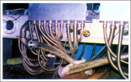 在泵或壓縮機(jī)與閥門、儀器儀表所構(gòu)成的輸送液、氣介質(zhì)的管道系統(tǒng)中,常因振動(dòng)損壞儀器儀表,縮短元器件的使用壽命,影響系統(tǒng)的正常工作,還因振動(dòng)產(chǎn)生的噪音嚴(yán)重危害操作者的健康。所以在泵的進(jìn)出口安裝一節(jié)泵連軟管可減小、吸收管系統(tǒng)的振動(dòng)和噪音,同時(shí)還能補(bǔ)償一定的位移,保護(hù)了系統(tǒng)正常工作,靜化工作環(huán)境,并消除了以往采用的橡膠軟接容易老化,耐溫性能差等常見(jiàn)病。